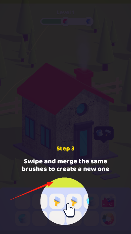 3、依据提示滑动合并同色刷子,把相同刷子融合,创造新工具用于后续房屋修复,体验工具合成机制。