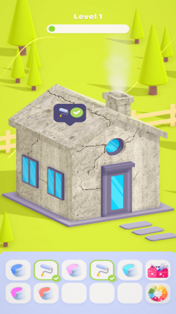 2、风格卡通画面舒适:采用卡通风格的3D画面,色彩丰富且搭配和谐,房屋和工具的设计可爱直观,整体视觉效果轻松舒适,让绘画过程更具愉悦感。