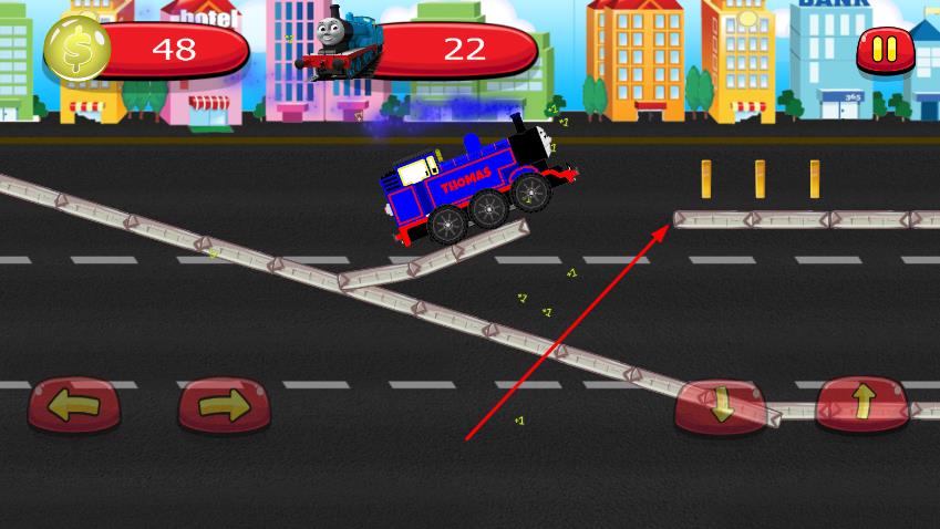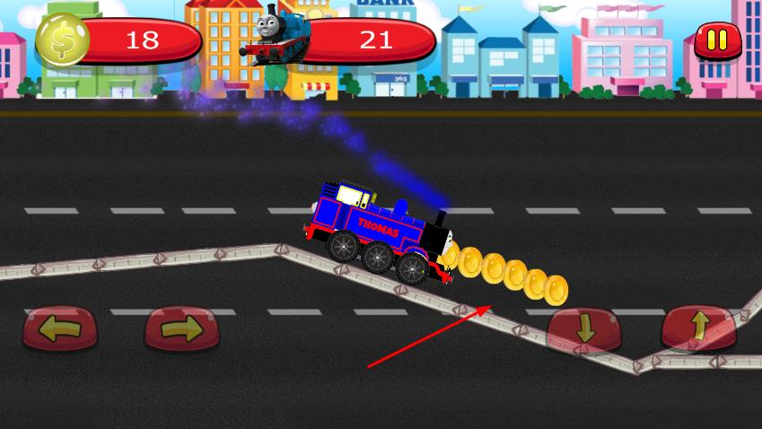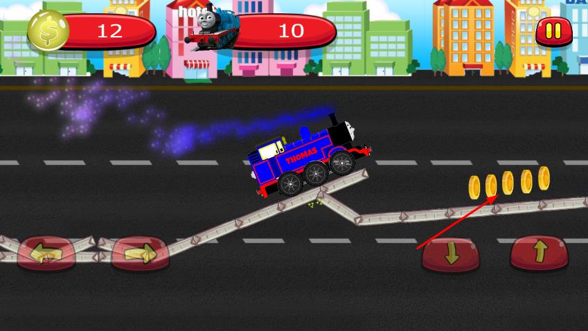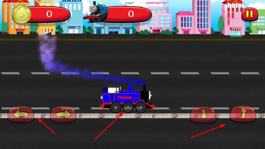 2、下方有方向控制按钮,包括向左、向右、向下、向上按钮,用于控制托马斯小火车的移动方向,在道路上行驶,躲避障碍物,收集金币。