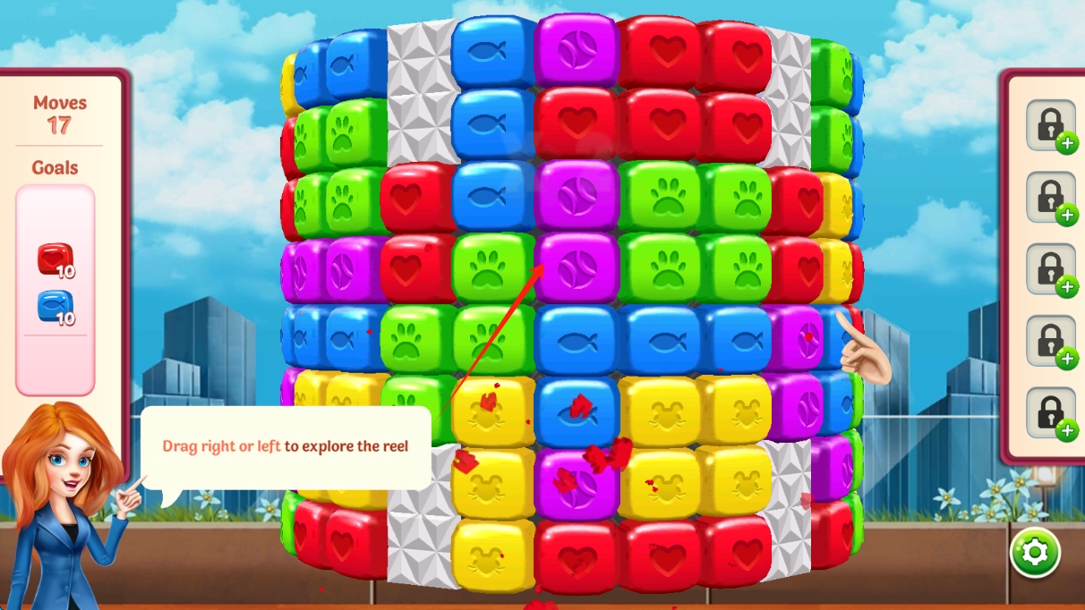 2、在游戏中,根据剧情引导,进入消除关卡界面,左右拖动探索卷轴,尝试消除相同图案的方块,完成关卡目标。