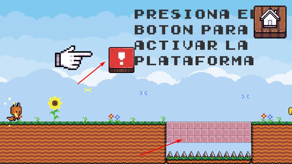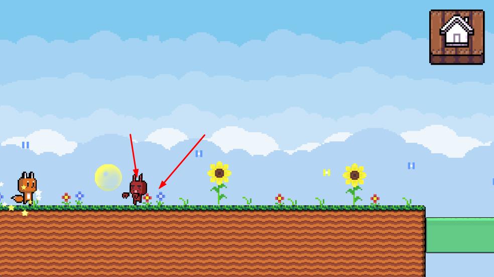 1、操控橙色的小狐狸角色在像素风格的场景中移动,场景中有草地、花朵、不同颜色的平台等元素。