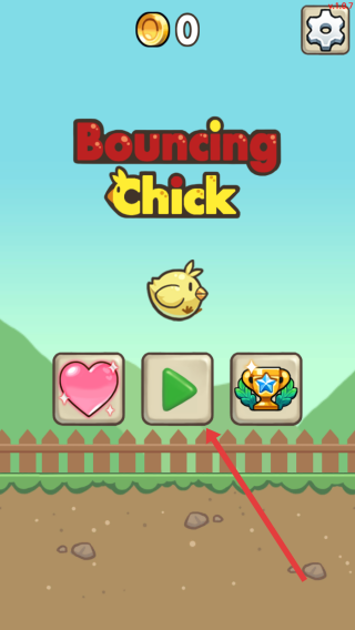 1、进入到Bouncing-Chick游戏主界面,根据箭头指向处,点击绿色三角形按钮,开始小鸡跳跃挑战。