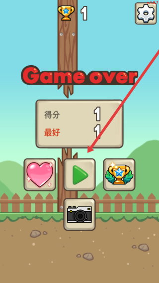 3、若小鸡撞上木桩游戏失败,在出现Game-over界面,点击绿色三角形按钮,重新开始小鸡跳跃游戏。