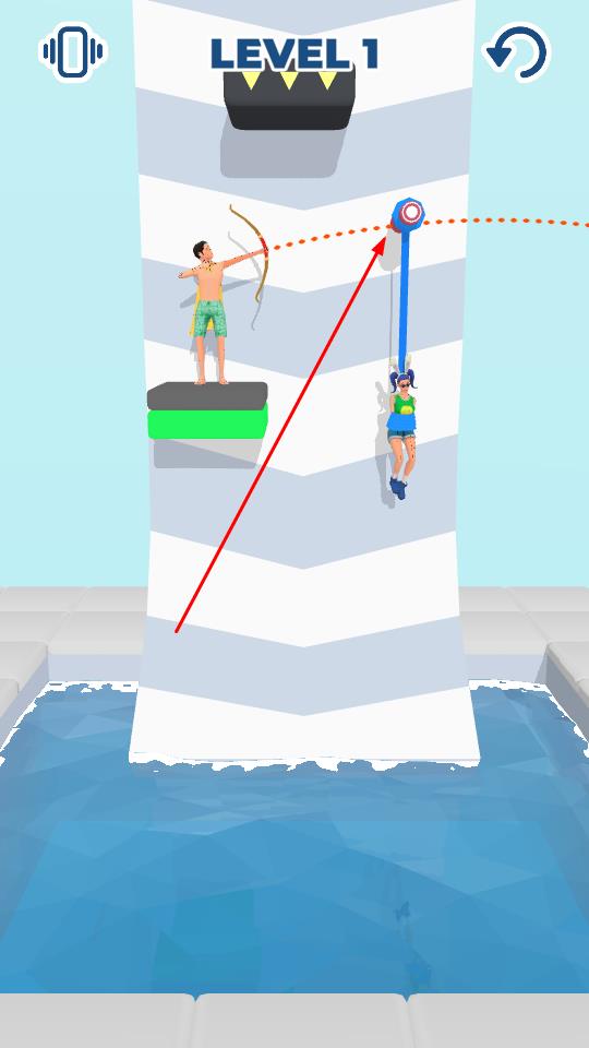 2、进入标注为LEVEL1的关卡后,长按屏幕任意位置,弓手会做出拉弓动作,同时出现红色指引虚线,确认角度无误后松开手指,弓箭便会射出,尝试切断绳索。