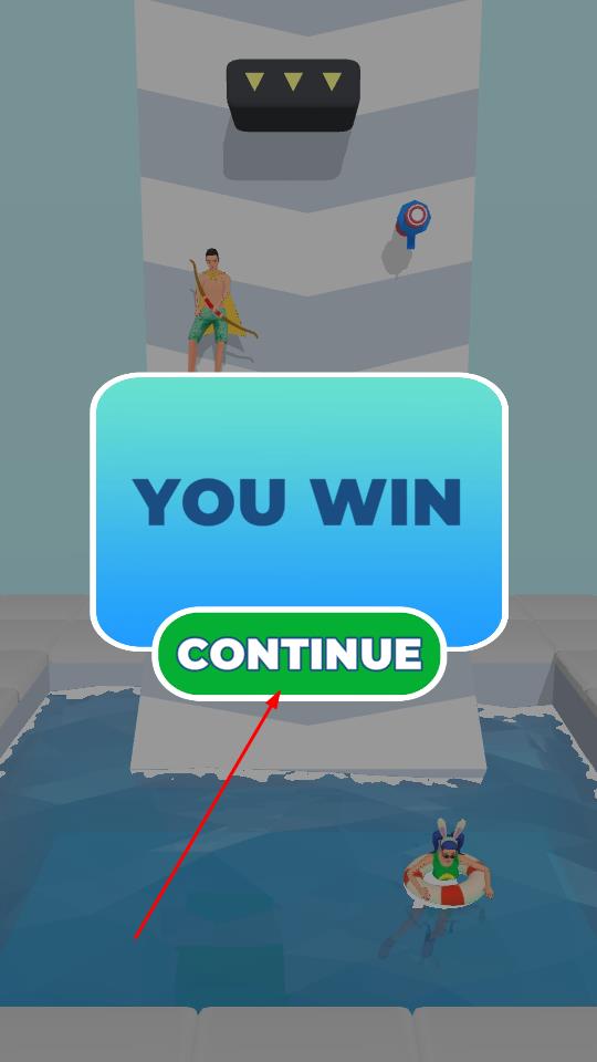 3、若弓箭成功切断绳索,被吊人物会落入下方水池画面呈现安全落水状态,随后弹出YOU WIN胜利提示,点击绿色CONTINUE按钮,即可推进至下一关。