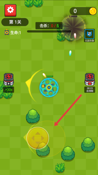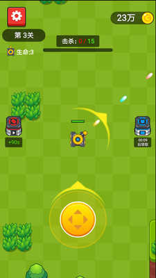2、在战斗中滑动下方方向键操控坦克移动,瞄准敌方目标射击,注意拾取场景中金币,积累资源提升战力。