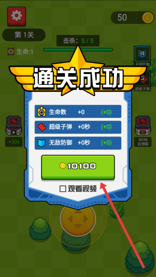 3、成功击杀5个敌人后,在通关界面可以点击绿色按钮,领取10100金币奖励,继续挑战后续关卡。