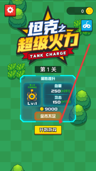 1、在游戏初始界面,通过点击黄色开始游戏按钮,随即进入第1关战斗,驾驶坦克开启火力挑战。