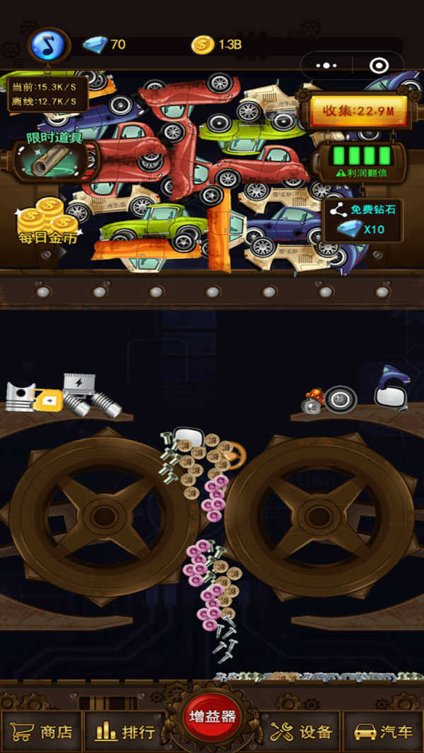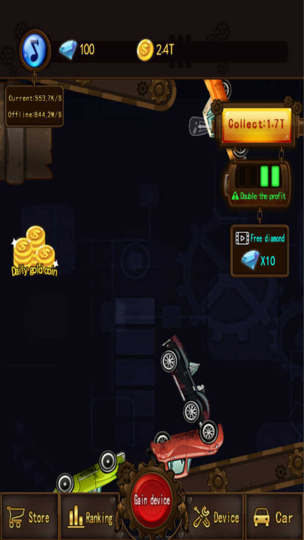 2、金币收集升级:在砸车过程中收集海量金币,用于升级机器零件、购买机油等,提升机器运行效率,以便在限时内摧毁更多车辆。