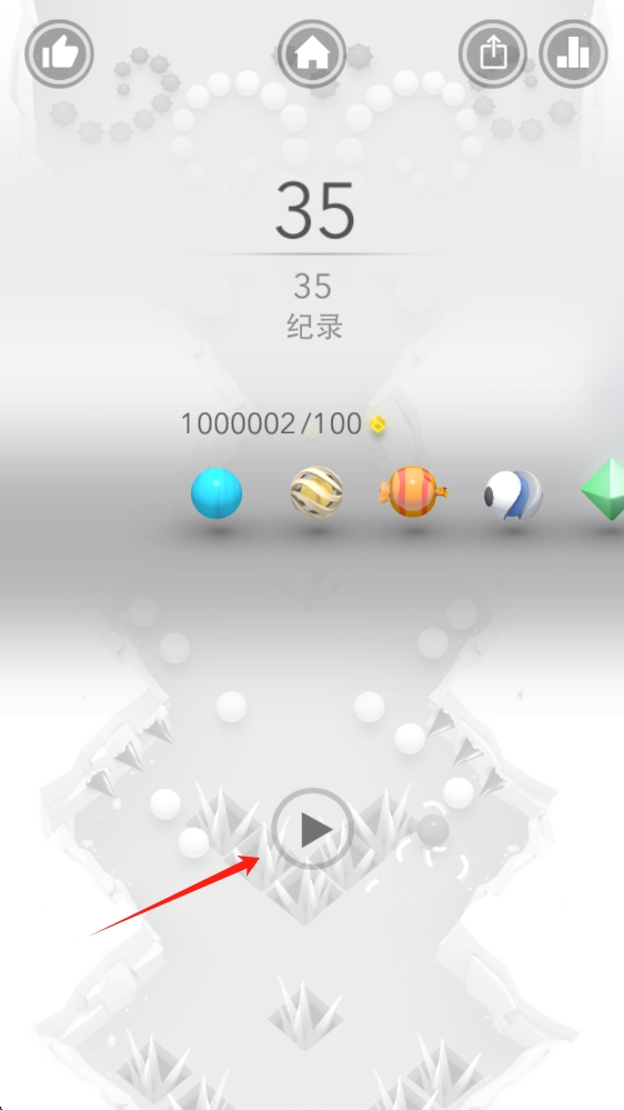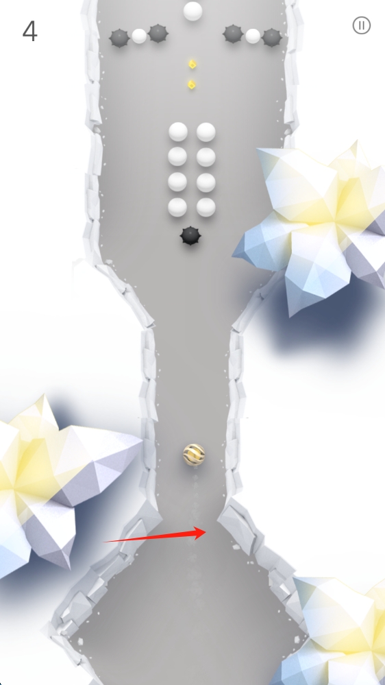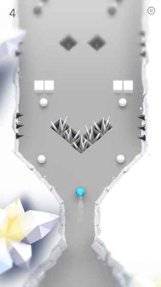 2、在游戏中,灵活操控球体,躲避白色球体和黑色尖刺障碍物,同时收集黄色菱形道具,争取获得更高分数。