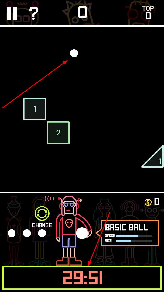 2、操控白色弹球,利用弹射角度,让其避开数字方块如1,2方块,同时可切换不同类型弹球如BASIC BALL,关注底部时间如29:51,争取长时间存活。