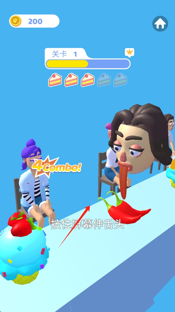 2、在游戏内操作界面,按住屏幕控制角色伸舌头,品尝各种美食,获取积分和金币。