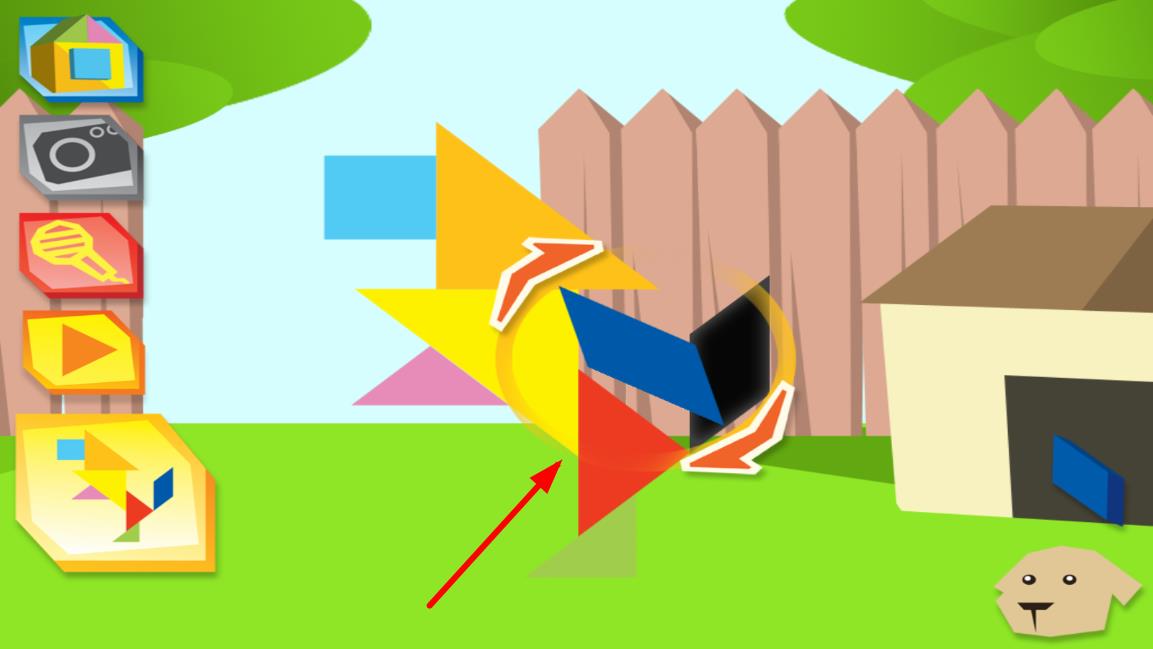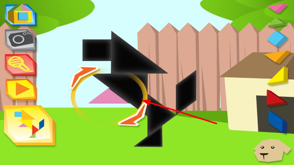 1、小朋友会看到屏幕上待拼的狗狗图案轮廓以及一旁的七巧板组件,先观察目标狗狗的形状特征,再尝试拖动不同形状的七巧板,将其放入轮廓中对应的位置。