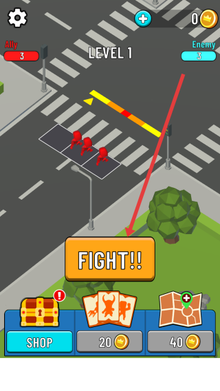 1、在Level-1界面点击橙色FIGHT!!按钮,派出己方红色角色与敌方蓝色角色在路口展开战斗。