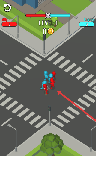 2、战斗中自动操控红色角色,在路口区域与蓝色敌方角色交锋,通过攻击动作争取胜利。