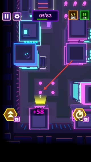 1、主界面点开始,进赛博赛道,操控角色移动,优先采+58发光块,留意计时和目标进度推进。