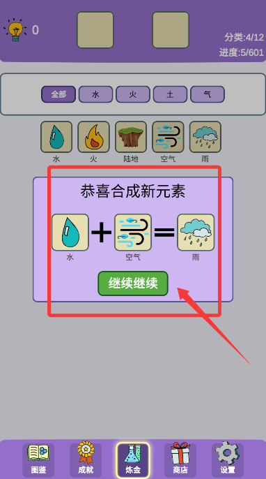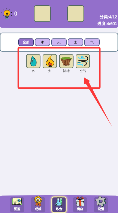 2、自由挑选"水""火"等初始素材进行组合实验,探索元素转化规律。