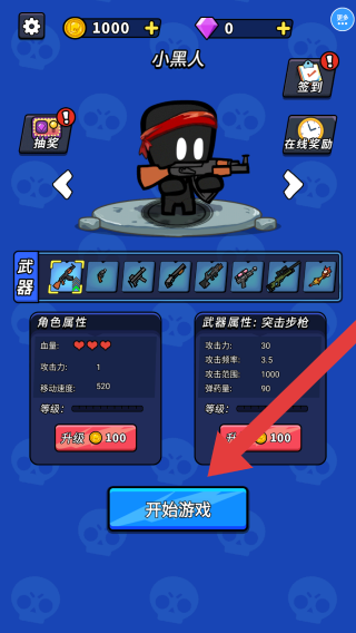 1、角色为小黑人,武器是突击步枪,有角色属性和武器属性展示,点击开始游戏可进入战斗。