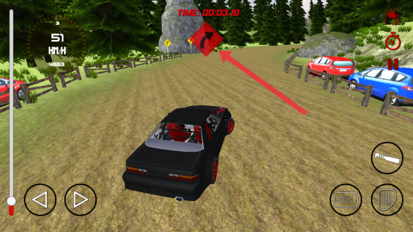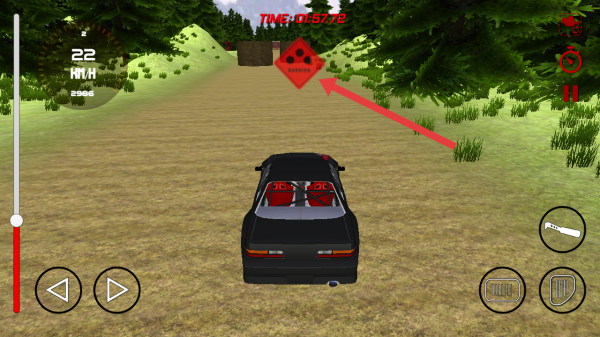 2、如果遇到红色障碍标志的区域,需要提前减速,操控车辆小心的绕过这三个木桩,防止碰撞停滞。