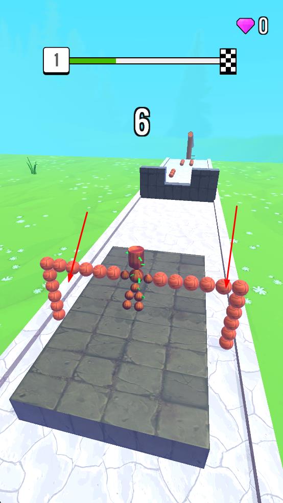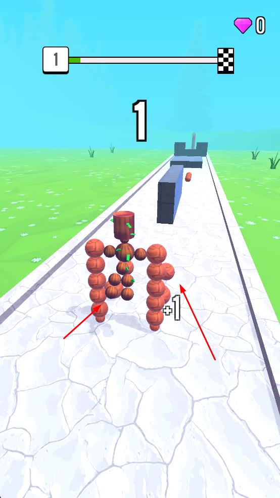 1、操控由棕色球体组成的角色在户外场景的道路上移动,场景中有绿色的草地、树木等元素。