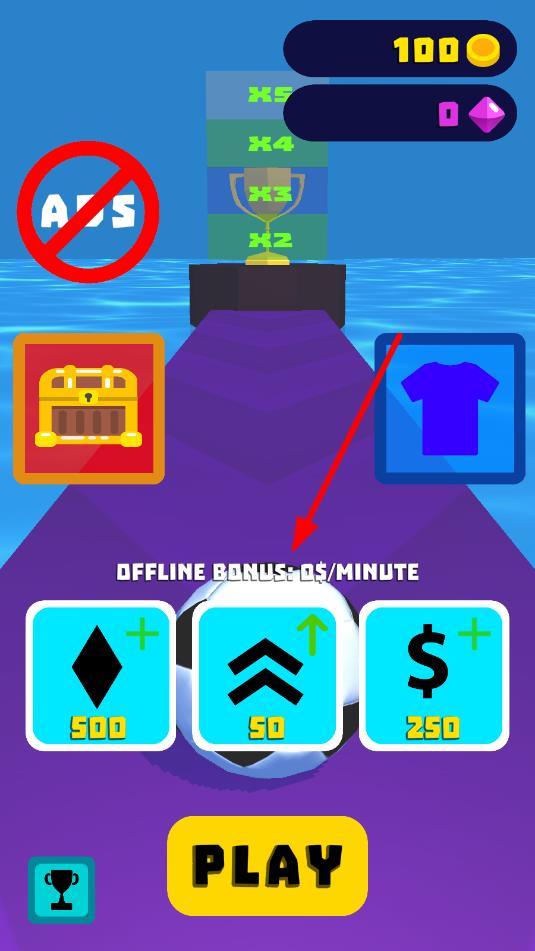 1、进入游戏前,在初始界面可消耗金币、钻石升级足球属性,点击 PLAY进入跑道关卡 。