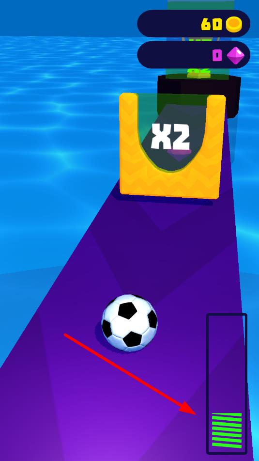 2、在跑道上,足球自动前进,遇到增益道具,像×2方块时,适时操作让足球碰撞,获取倍数加成等效果,助力冲刺。