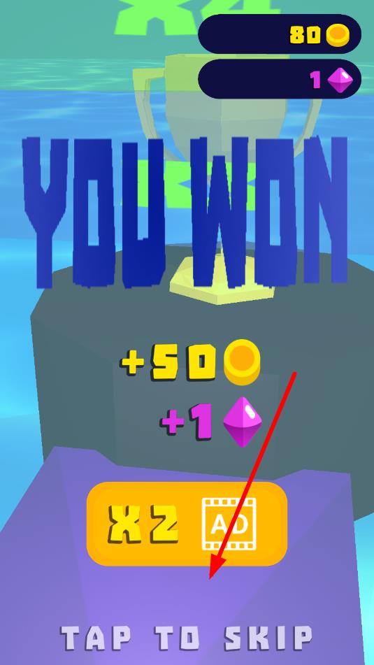 3、成功抵达终点后,触发YOU WON胜利提示,获得金币、钻石奖励,可选择TAP TO SKIP跳过广告,或看广告翻倍奖励,继续下一局。