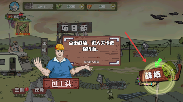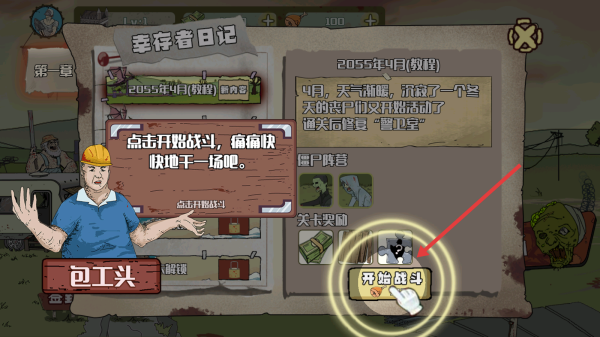 1、主界面点战场,进幸存者日记关卡页,选章节后点开始战斗,开启打僵尸流程。