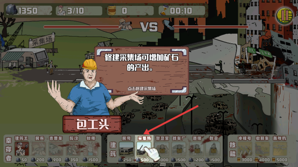 2、战斗场景按提示,点建筑栏采集场图标,修建筑增矿石产出,支撑对抗僵尸。