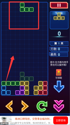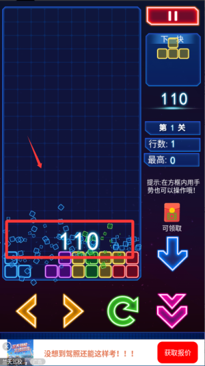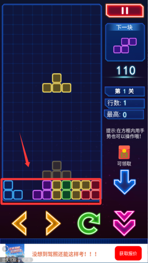 1、开始游戏后先观察方块下落的位置,合理调整摆放方式,尽量让方块填满一行或多行实现快速消除。