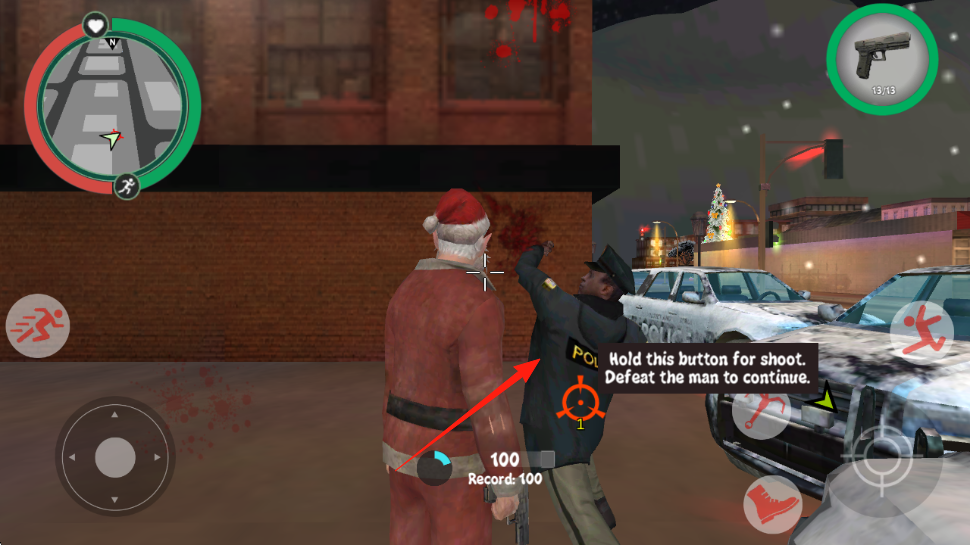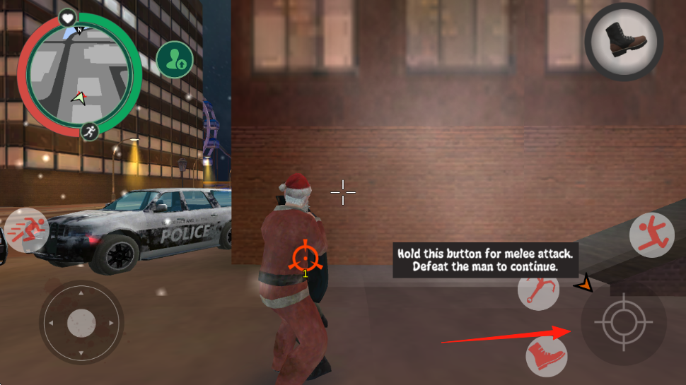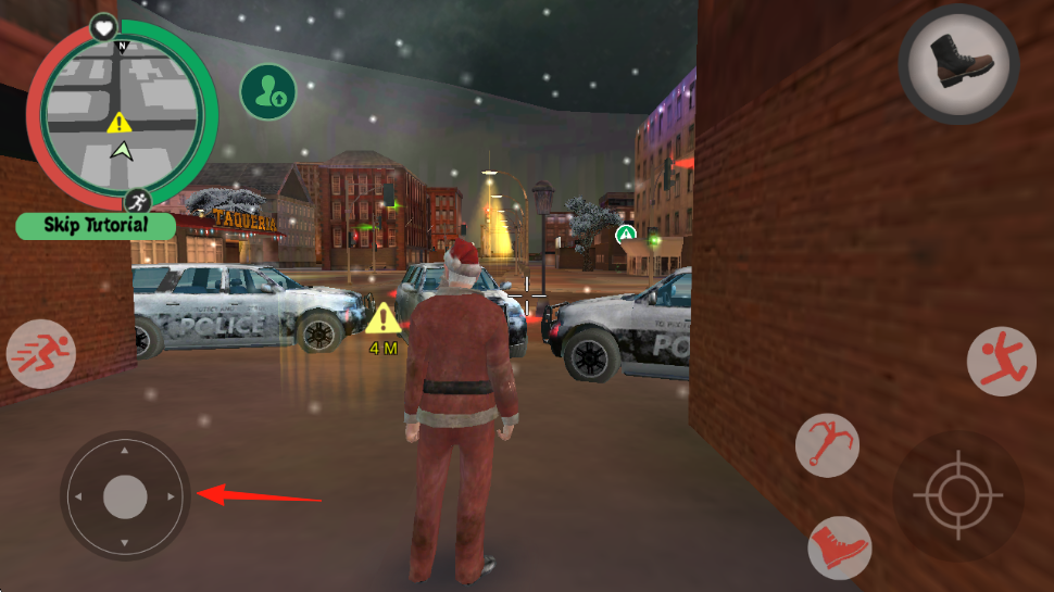 1、用左侧摇杆控制圣诞老人移动,探索城市街道,靠近警察敌人黄三角警示。