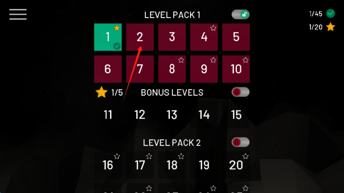 2、关卡选择时,点击LEVEL-PACK-1下的关卡2,进入新关卡,迎接激光解谜挑战,点击选择关卡。