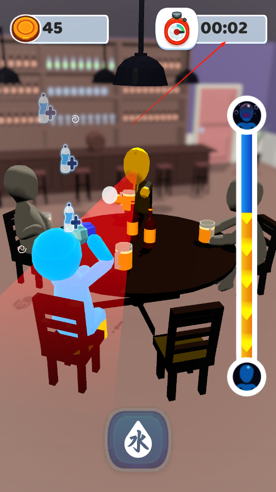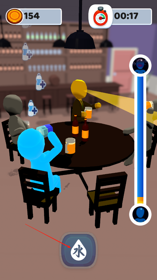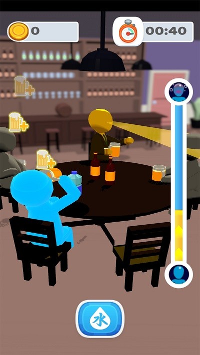 2、右上角有倒计时,在倒计时内注意不要醉酒,当老板注视自己的时候,不要喝水,如果老板盯着的时候喝水则会立刻倒下。