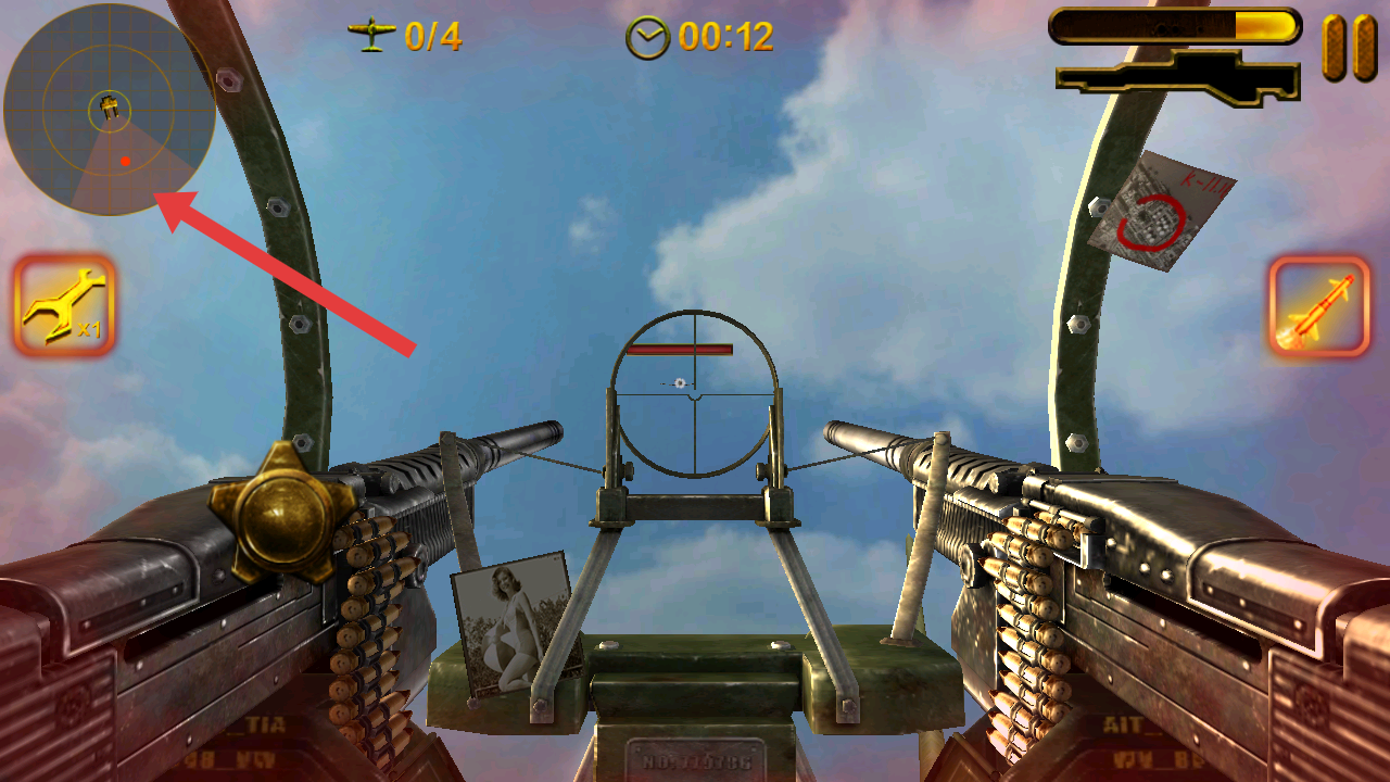 2、需要紧盯左侧的雷达,依据红点标识定位敌机位置,提前预判轨迹,准备进行射击。