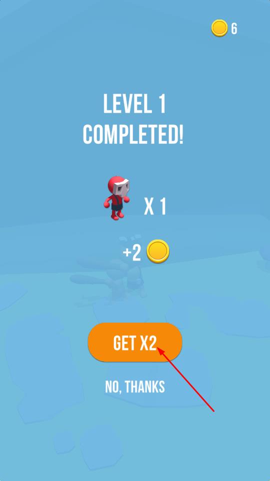 3、成功击败关卡怪物后,弹出LEVEL 1 COMPLETED!通关提示,可选择点击橙色GET X2按钮获取翻倍金币奖励。