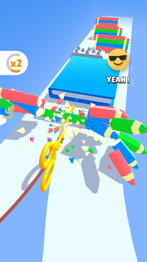 2、道具使用应对挑战:赛道上会出现各类道具,比如能暂时扩大剪刀范围的道具,可一次性剪开大片障碍,快速通过长距离赛道,使用道具能降低闯关难度,让过程更顺利。