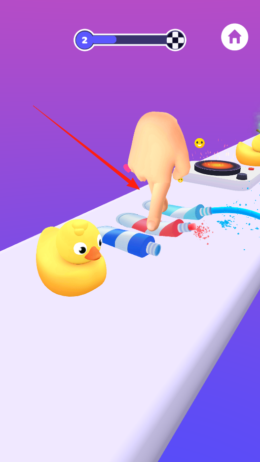 2、拖动手指操作手移动,点击颜料管为小黄鸭上色,避开干扰,完成色彩搭配,体验上色互动玩法。