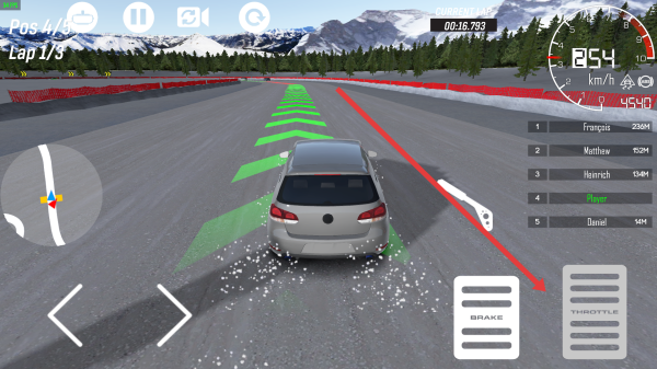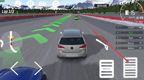 1、开启游戏,起步猛踩油门右侧按键,用户利用绿色加速带提高速度,需要超车优先走内道。