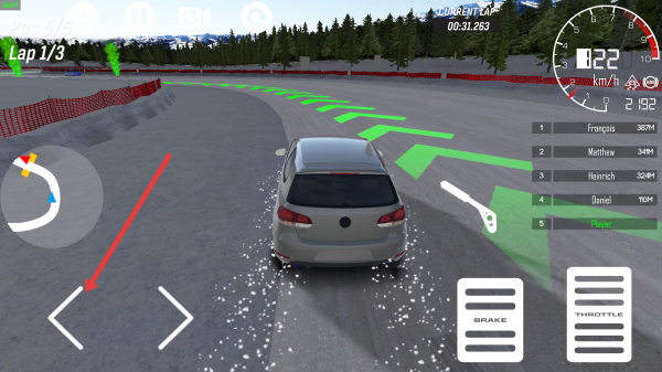 2、前方要遇到弯道前轻按刹车左侧按键减速,贴绿色箭头轨迹过弯,减慢速度,别撞护栏掉速度。
