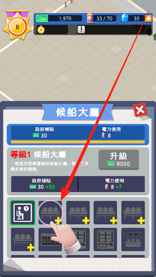 2、通过合理安排客人和游轮停靠,赚取收入,规划资金使用,准备对码头进行首次升级。