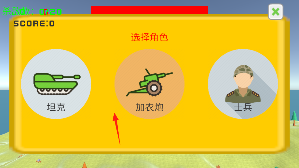 1、进入游戏后,会出现开局选角色推荐加农炮,火力强,进入战场。