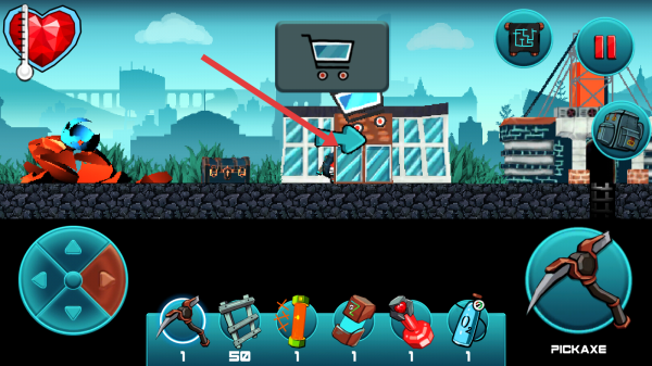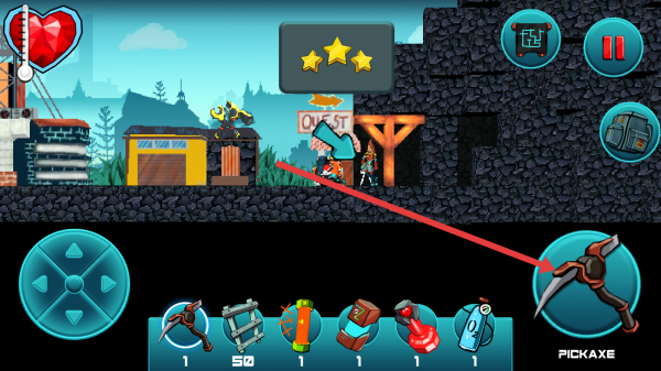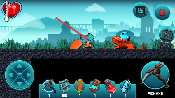 1、需要摇杆控制移动,优先跟箭头做主线如找建筑、NPC,遇到怪物用镐子攻击,没血吃道具。
