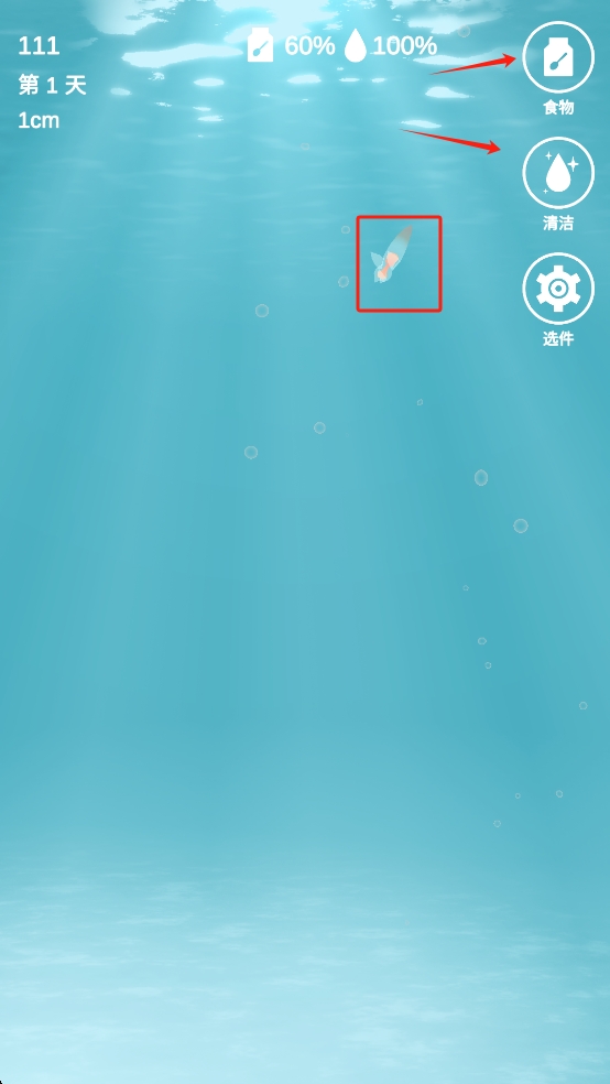 1、进入游戏,关注上方食物、清洁等状态,点击对应图标,给海洋生物喂食、保持水质,维持生存环境。