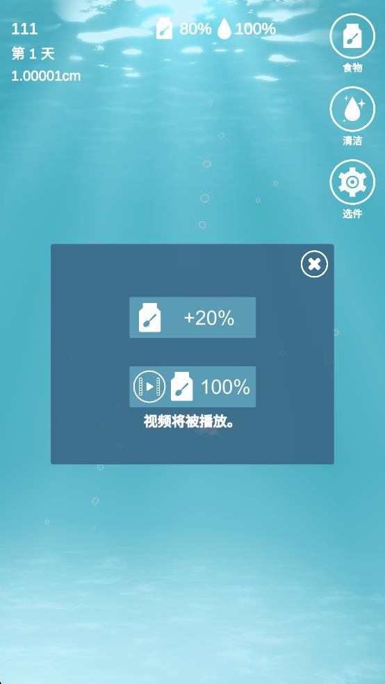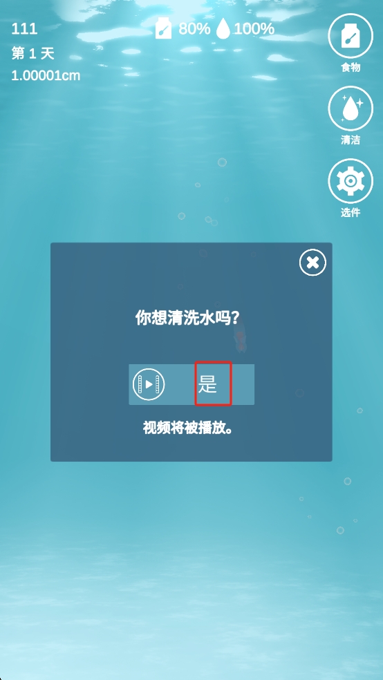 3、出现你想清洗水吗的弹窗,点击是按钮,观看视频完成水质清洁,持续优化海洋生物生存环境。