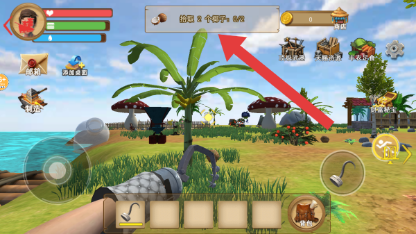 1、画面展示了一个海岛的场景,有棕榈树、蘑菇状建筑等,界面上方提示拾取2个椰子进行操作。