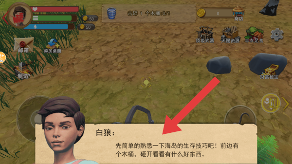 2、任务提示击碎1个木桶,还有邮箱、添加成员、抛投等功能,以及商店、饥饿值、干饭汪等界面元素,是一款海岛生存类画面。
