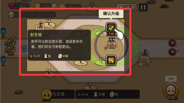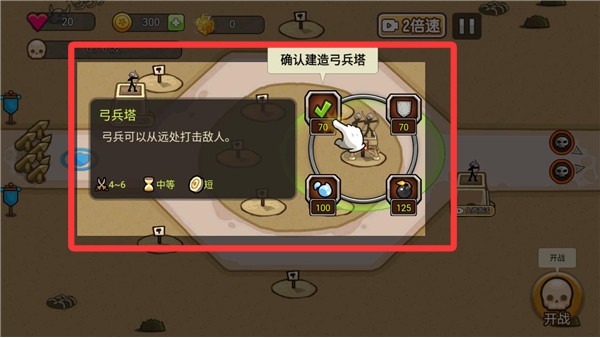 3、选择防御塔基地,选择弓兵塔,并确认建造弓兵塔,实现从远处打击敌人的效果。