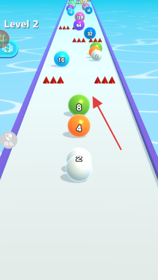 1、在第2关游戏中,操控小球移动,让数字相同的小球相撞合并,如数字8和8的小球相撞会合并成16,同时避开红色尖刺障碍物。