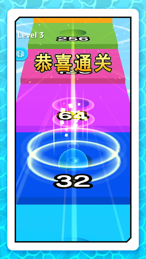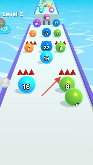 2、进入第3关,继续通过移动小球,使相同数字的小球相撞合并,逐步合成更大数字,注意躲避红色尖刺,顺利推进游戏。