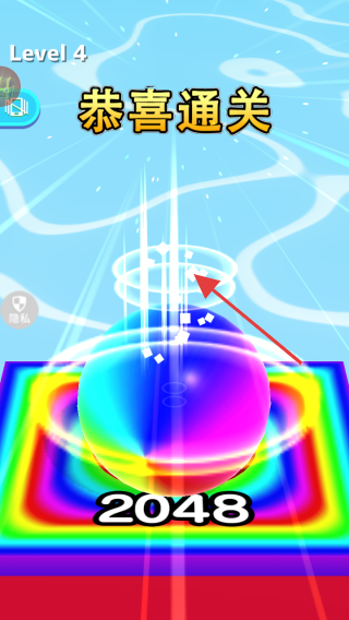 3、在第4关,不断合并小球,当合成数字2048的小球时,即可成功通关,屏幕会显示恭喜通关字样。